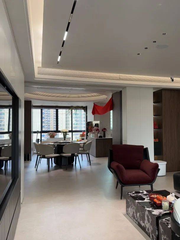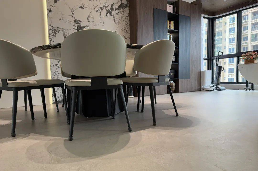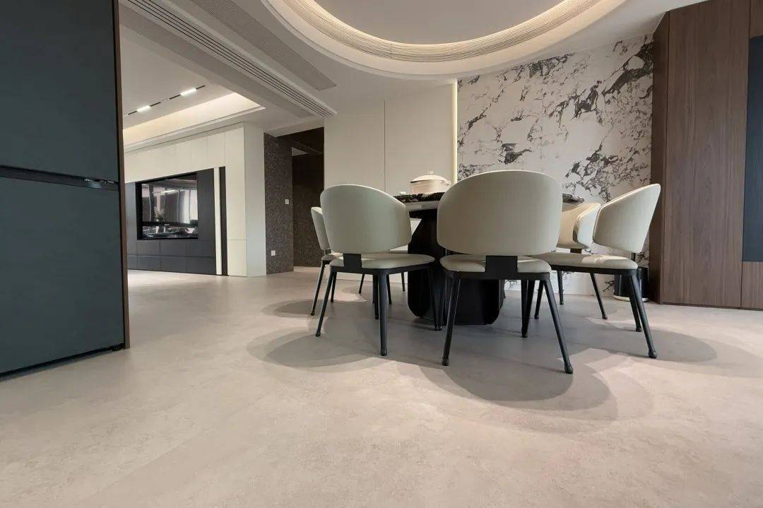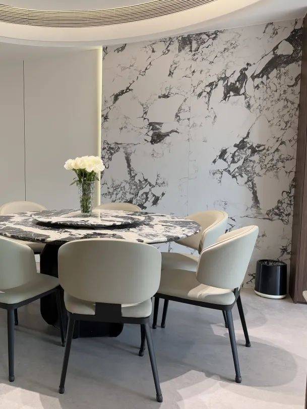 餐厅区域也是绝绝子呀~圆形的餐桌配上几把米白色的餐椅,简约又优雅。旁边的墙面和地面瓷砖的搭配真的太赞了,高级感爆棚,在这里吃饭都感觉食物变得更美味了呢~