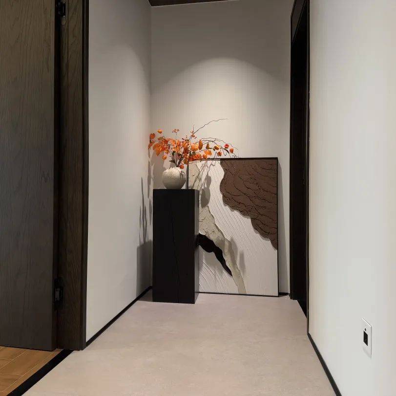 走廊设计简洁有力,墙壁以白色为主,纯净无瑕,深灰色装饰增添层次感。走廊尽头的橙色花枝在黑色基座上绽放,现代艺术画为空间注入艺术气息。深灰色门扉整齐排列,沉稳色调彰显低调奢华,整个空间尽显高雅尊贵。
