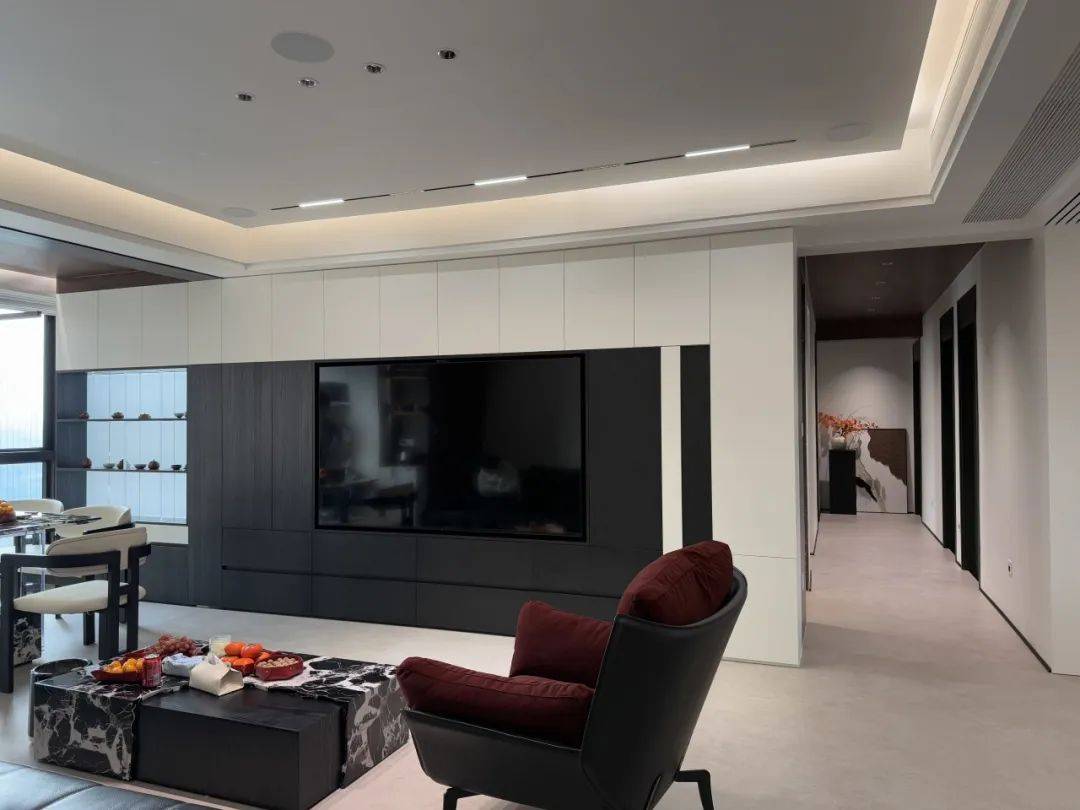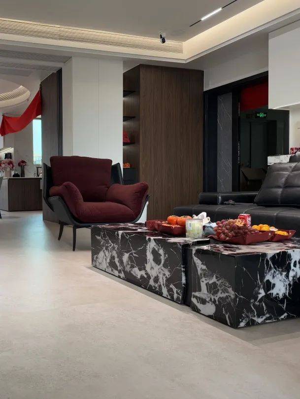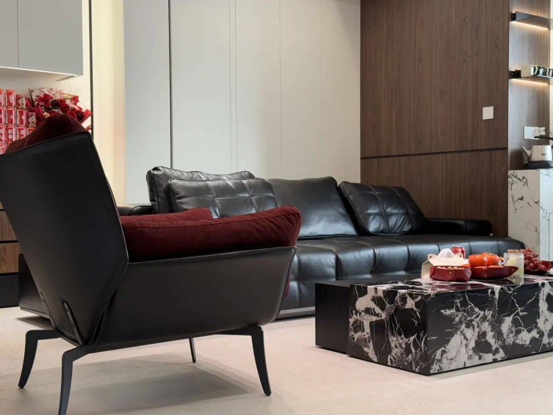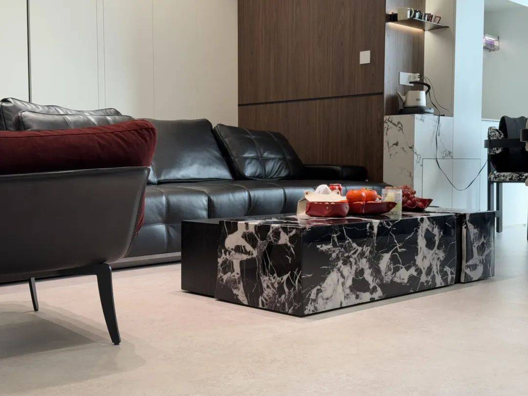 沙发前面是一个由宝格丽黑·月华瓷砖精心制作的茶几,茶几上摆放着一些水果和装饰品,包括红色的水果和白色的蜡烛,增添了生活气息。