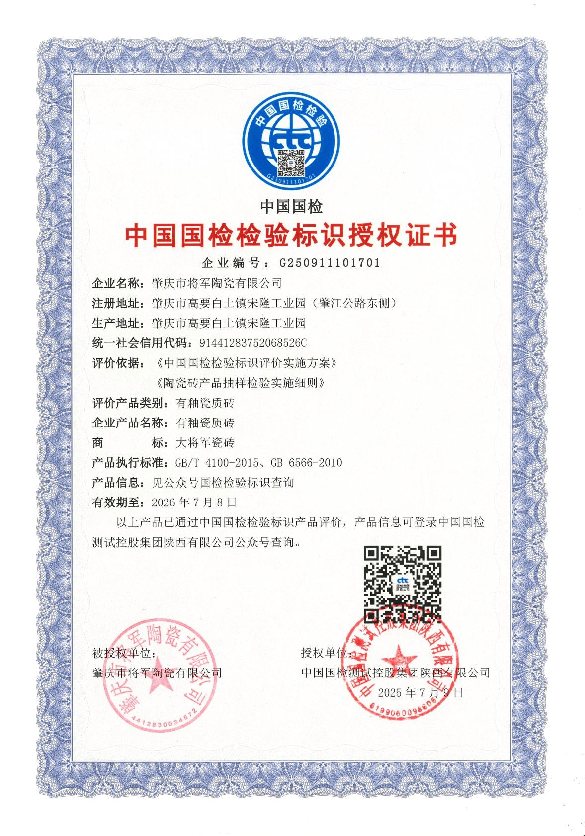 在夯实产品品质的基础上,大将军瓷砖始终以更高标准自我加码。近日,大将军瓷砖产品正式获得“中国国检检验标识授权证书”,标志着产品品质再次获得国家级权威评价认可。