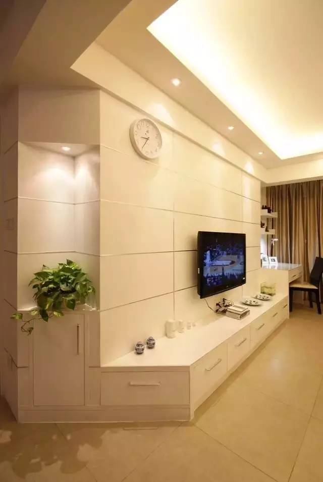 由电视墙形成的隔断时尚感十足,让人眼前一亮。这种隔断轻巧实用、色泽淡雅,并且能节约客厅面积。