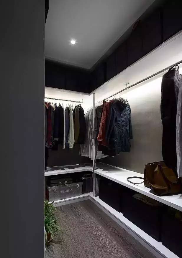 ▲现场制作的衣帽间,背景用了深灰色墙纸处理,加上暗藏的灯光带,私人空间也有了小生机。