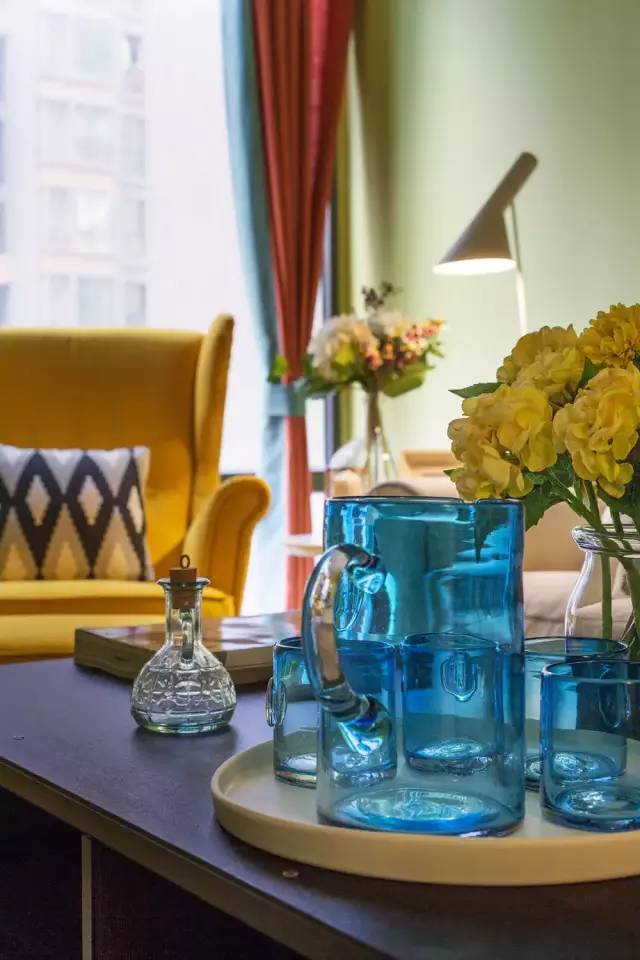 ▲蓝色的冷水杯与黄色的沙发,是冷与暖的冲击。