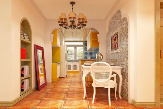 白色的吊顶,白色的墙面,带来一抹明亮与大气。美式田园风格的餐厅,内涵中透露出宁静婉约。仿古砖拼花的地板,搭配古典迷人的吊灯,让人觉得高端大气。内嵌式的圆拱形书柜,节约了空间。白色风格装饰的餐桌餐椅,背景墙是仿古石砖拼花的墙面,带来复古迷人味道。