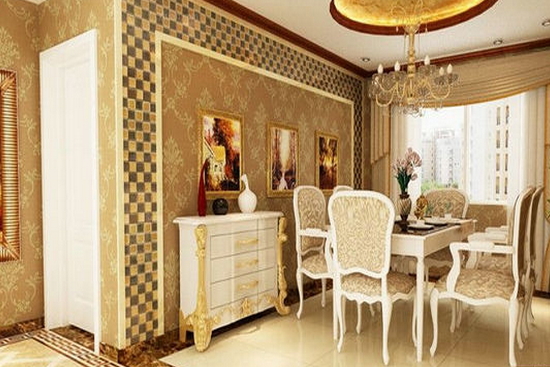 宫廷式装扮的餐厅,带给人高贵大方的享受。圆形的吊顶下是古典大气的水钻式吊灯,印花图案的简约大气餐桌餐椅,带来别致的舒适感。背景墙十分艳丽,中间是印花壁纸,两边是马赛克边框,十分具有对称复杂魅力。