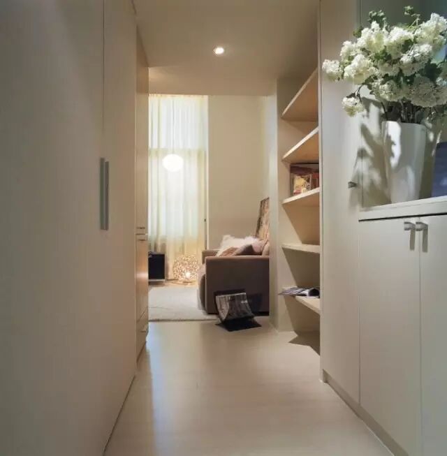 今天就给大家来一套这样的案例这是一套位于台湾的46平米小户型跃层让我们一块看看吧▲这是进门的地方做了一个鞋柜玄关还打了一排敞开式柜子这样就不用担心东西没地方放了走廊的尽头就是一个小客厅了▲客厅非常紧凑发置了一个双人沙发▲墙上挂了装饰画但没有摆放茶几因为空间实在太小了▲在沙发面对楼梯的地方做了一个小电