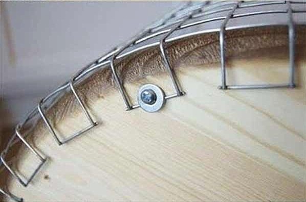 step 2:固定网筐。把螺丝和螺丝垫片卡住铁丝,再拧进木板,再同法拧入其他7组螺丝和垫片