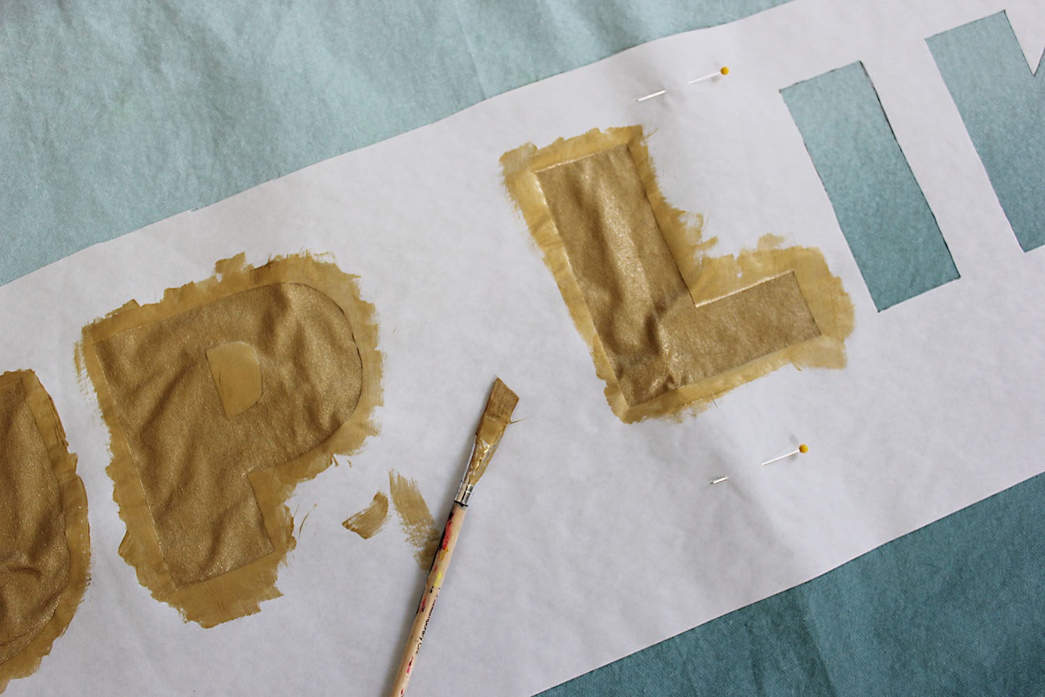 step 3:用大头针把纸和浴帘别在一起,再用画笔把金属色漆料涂到剪出的空处