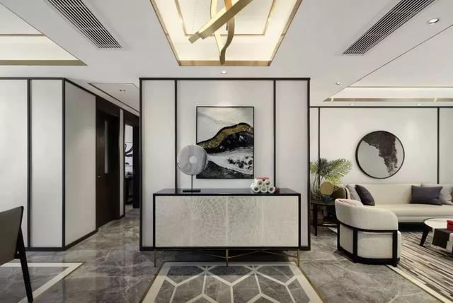 运用转折手法呈现出若隐若现的感觉,搭配着三两幅古典的壁画,在拐角处加上一个壁橱,吊顶上两个方形的吊灯,让整个过道显得宽敞明亮。