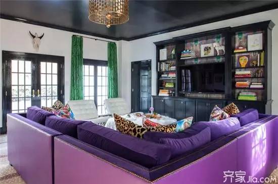 以一个大型的橱 柜融合电视柜、橱 柜、书柜等功能于一体,这种紧凑的设计更节省空间也让小户型在视觉上更为整齐扩容。紫色沙 发、绿色窗 帘,大胆的用色营造一种优雅魅惑的氛围。