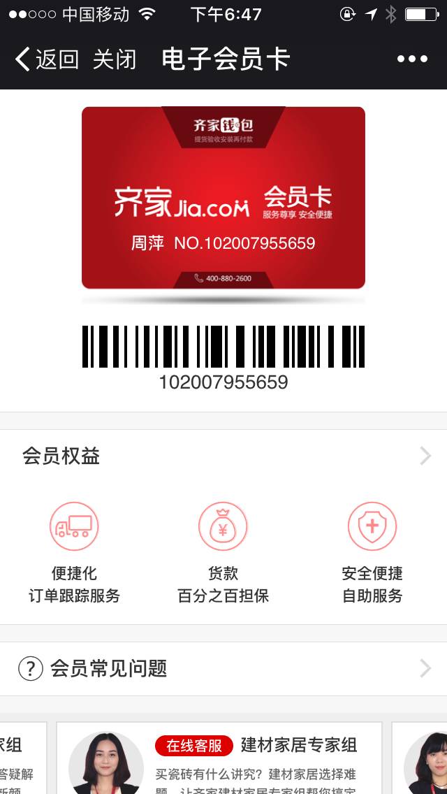 其实,齐家的所有用户都是齐家的会员,因为齐家本身实行的是会员制,没有会员卡是开不了单的,所以,每一个在齐家消费的网友都是有会员卡号的。