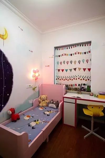 儿童房的粉色小窗,还可以变长缩短,根据孩子的年龄成长来推拉,孩子较小的时候就收起来,腾出更多的活动空间;而床边的这面墙,也是以可爱童趣的图案打造,搭配童趣的气球灯,显得格外的浪漫情趣;