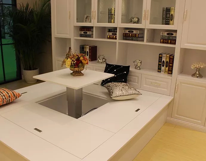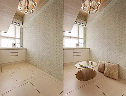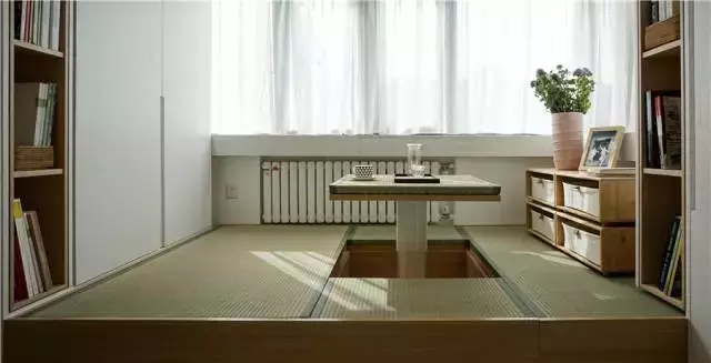 经过改良的榻榻米,你希望它是可以平躺的卧室时,它就是卧室,你希望能有个地方在午后喝喝小茶,那只要将榻榻米小桌上升就可以了。