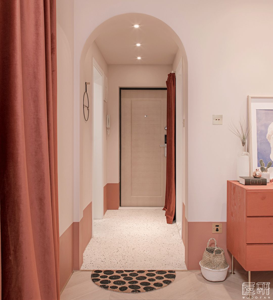 玄关处粉色水磨石,餐厅的拱形门都保证了视觉效果。更突出的是设计师对于餐厅客厅的两个空间分色墙面的设计,灰绿和脏粉的对比呼应,分分钟是pin站上被下载千次的模范美设计,让人大呼惊艳。
