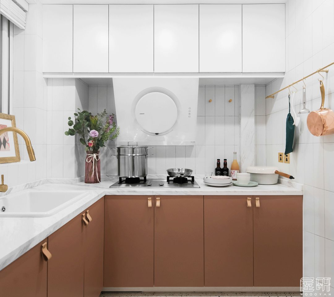 这次项目的厨房使用的拼法虽然中规中矩,但是搭配大理石台面就有了非常出彩的效果。