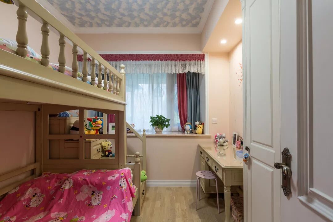 ▲儿童房墙面以奶咖色为主,呈现出一个浪漫温馨的优雅空间,搭配一张象牙白的上下铺,还有侧边的书桌,小小的空间为孩子们带来了实用的在家学习空间。