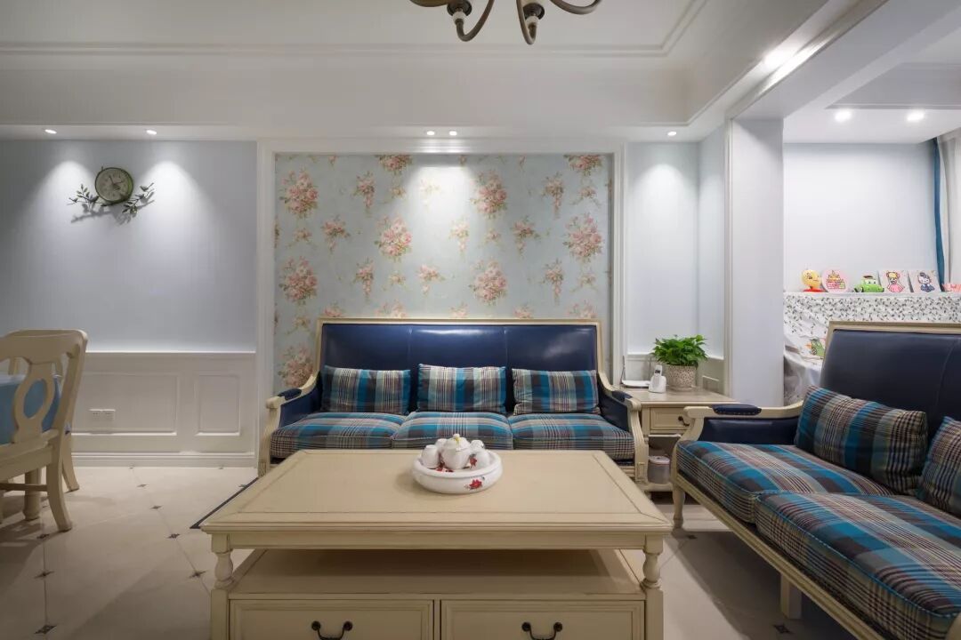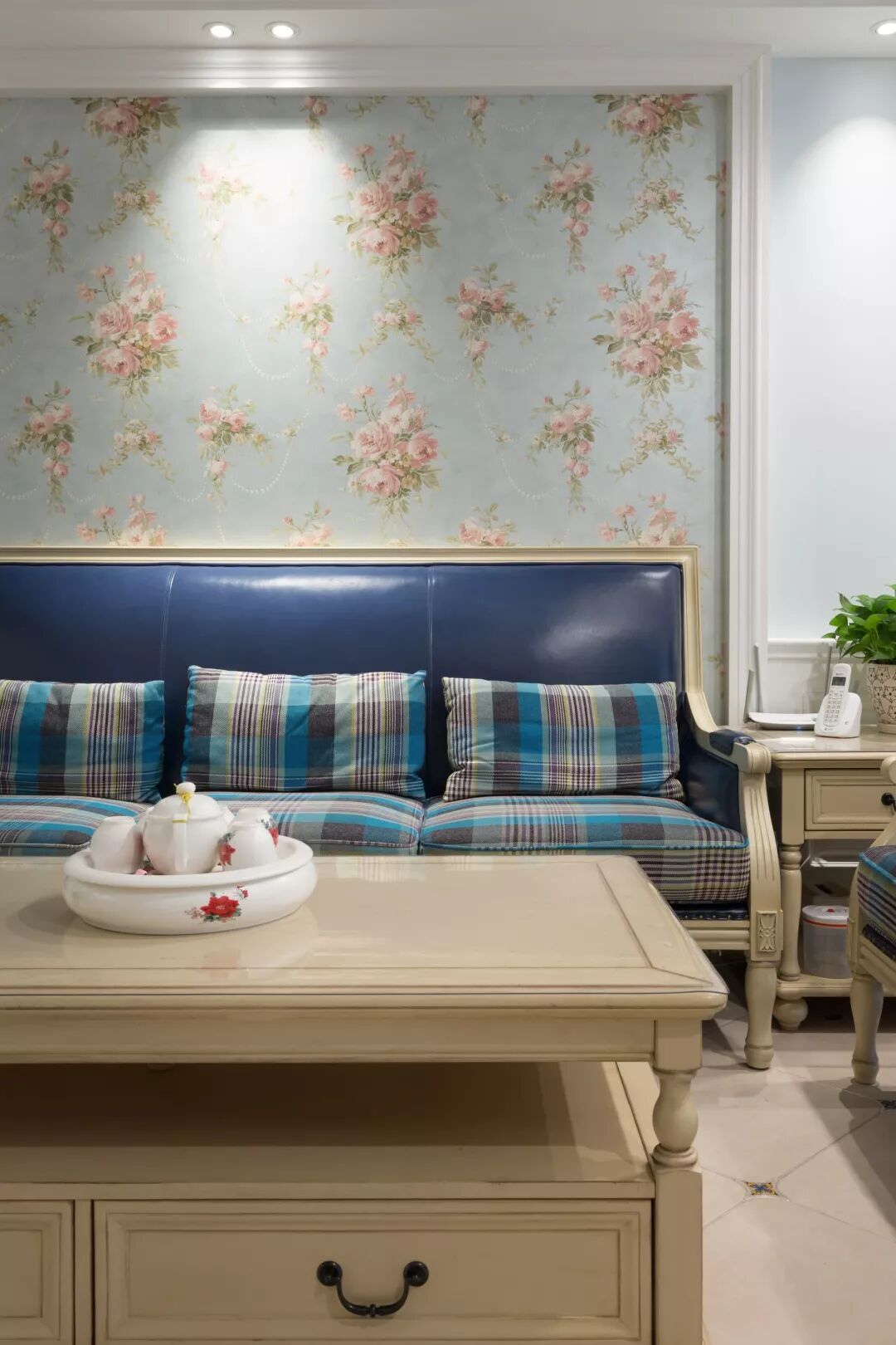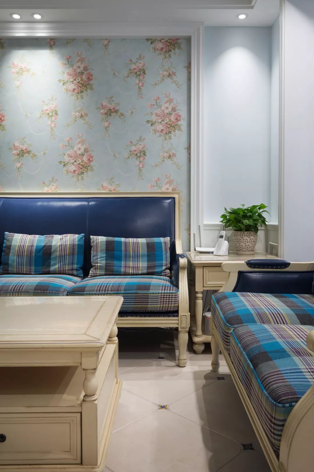 在装修风格方面融入了美式、田园、欧式等洋气的搭配,通过淡蓝色与小碎花的墙面搭配,结合上象牙白的家具,装扮出一个浪漫优雅的家,充满了精致华丽的气息。客厅▲整个客厅以清新淡雅的格调为主,电视墙的硬包搭配成品电视柜与斗柜收纳,呈现出一个轻松舒适的待客空间氛围。▲蓝色皮沙发,结合一套格纹坐垫,在田园花饰的沙