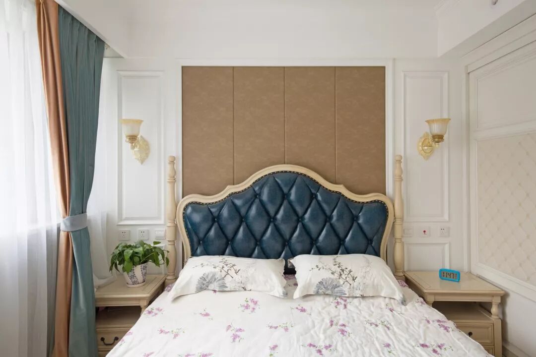 ▲卧室床头背景墙在软包处理的基础结合边框造型与壁灯,摆上一张欧式皮艺靠背的床,还有一款清新精致的床单,呈现出一个华丽优雅的气息。