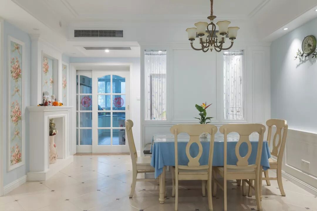 ▲餐厅淡蓝色为主的墙面,搭配一套象牙白餐桌椅与蓝色桌布,一侧墙面留白挂一个挂钟,而餐厅背景墙则做了个壁炉造型,搭配鲜花墙饰,显得充满精致优雅的浪漫气息。