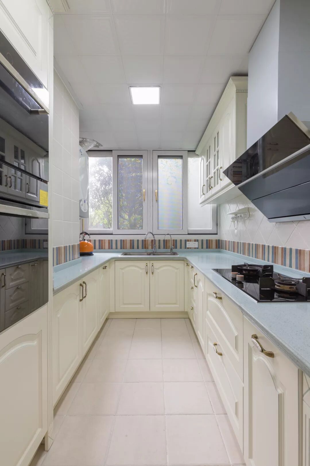 ▲厨房以U型的布局,白色橱柜搭配灰色操作台面,墙腰还以彩色砖装了一圈的装饰,让厨房充满了活力的气息。