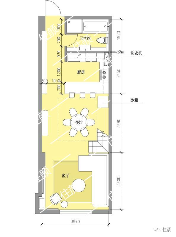 一层是客厅与餐厨空间,客厅层高 3 米,厨房层高 2.6 米。