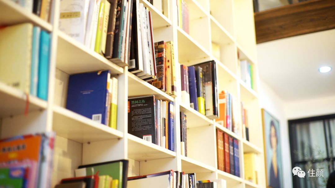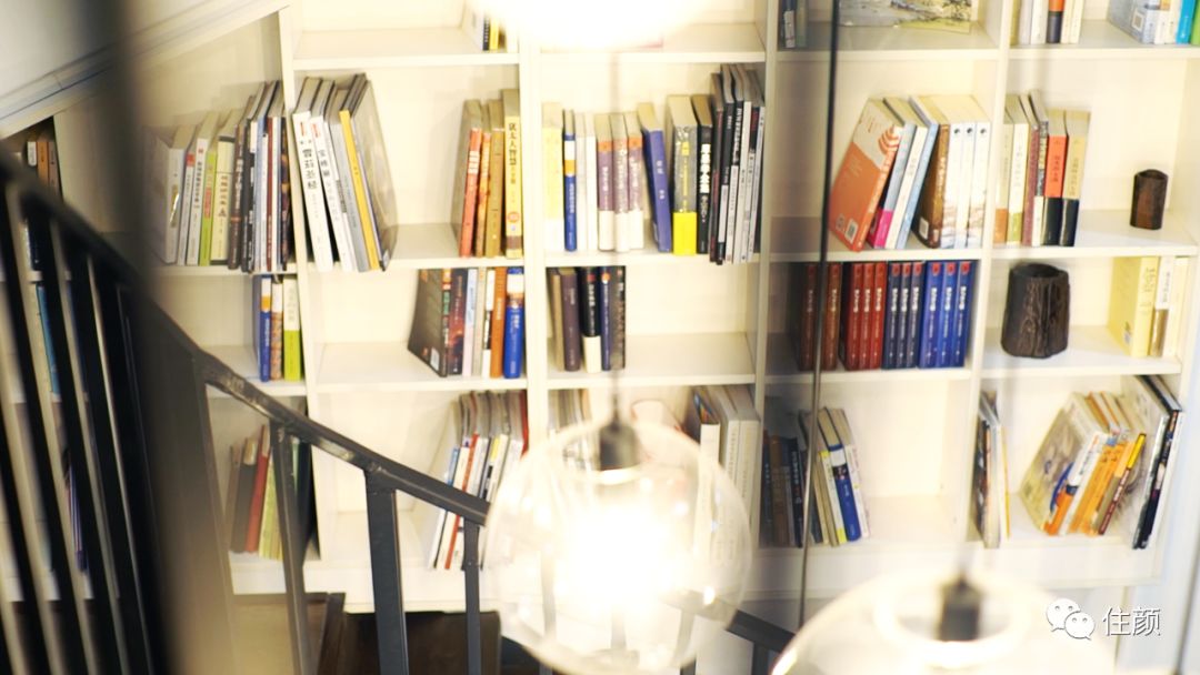 小米的解决方案,是将整面墙做成了内凹式的书架,横线条的架与竖立摆放的书,再加上两段书架之间的斜线条,一下就让这面墙变得实用且美观,旋转楼梯空间的氛围也变得更具艺术感。
