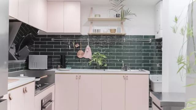 这次的厨房配色非常大胆地用了“粉配绿”,不是中规中矩的常见配色,视觉上很有冲击力,让人眼前一亮,打破常规但依然确保高颜值。
