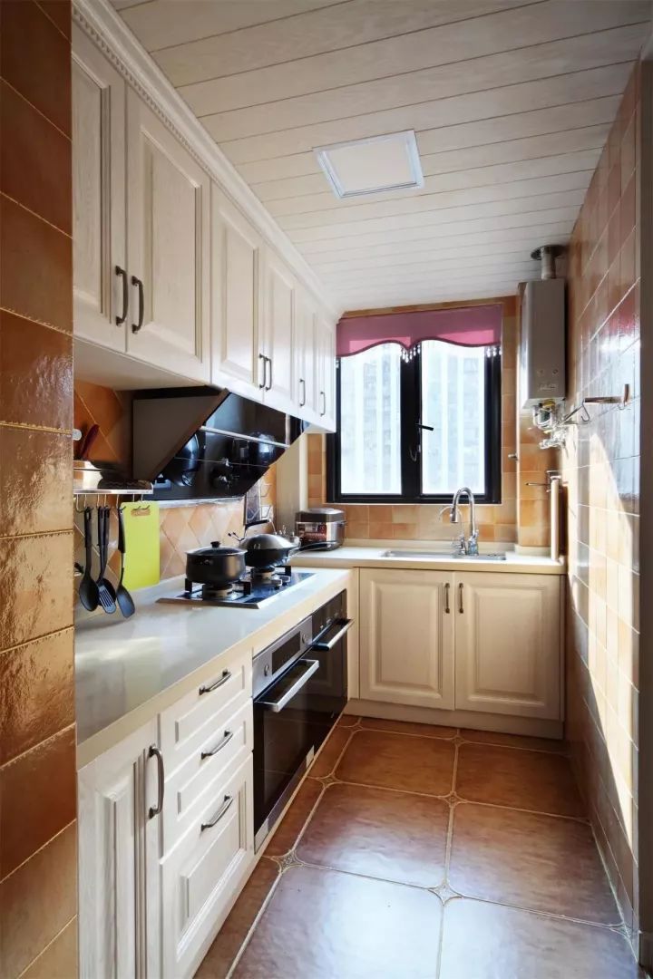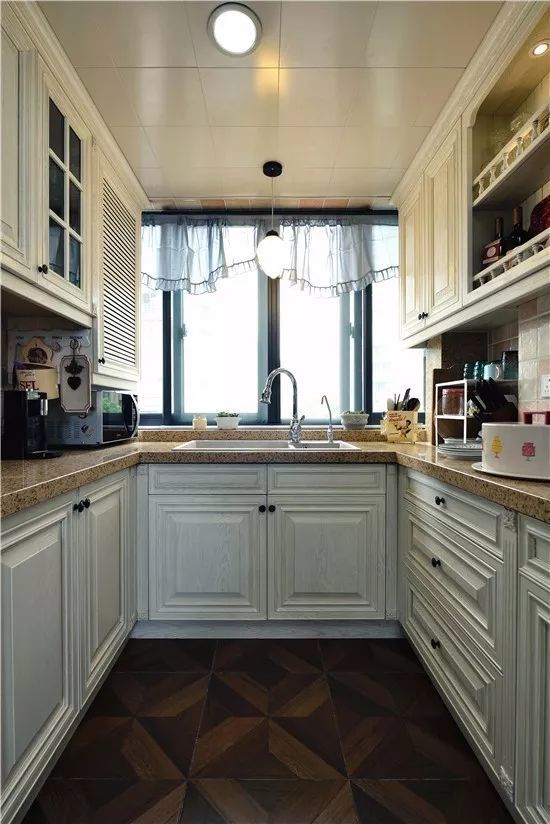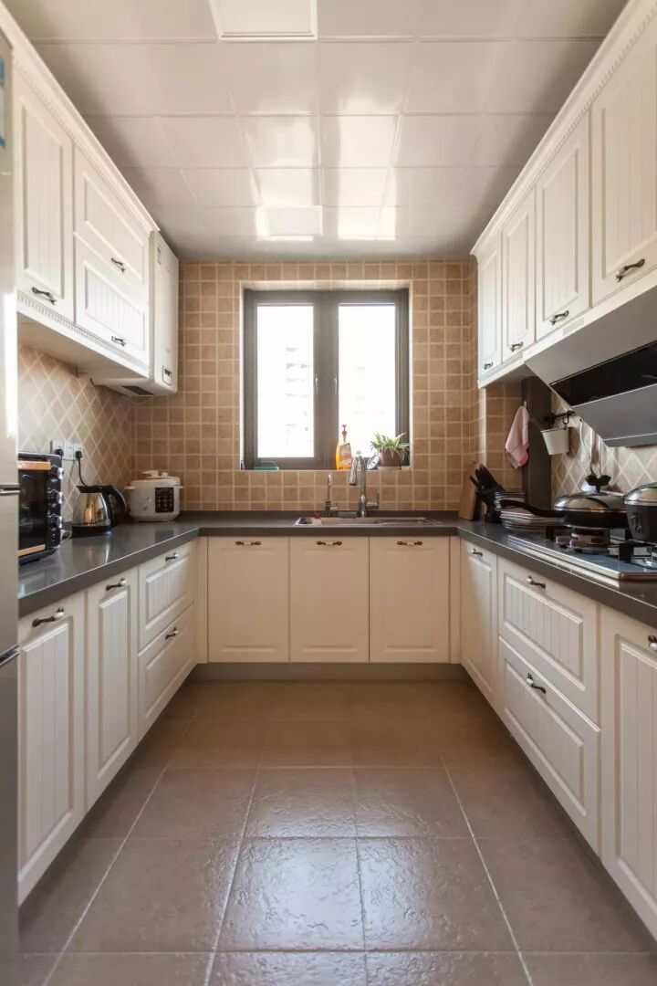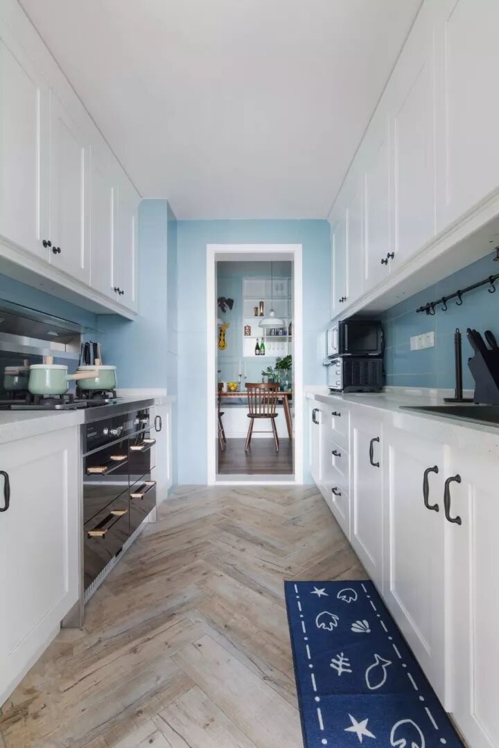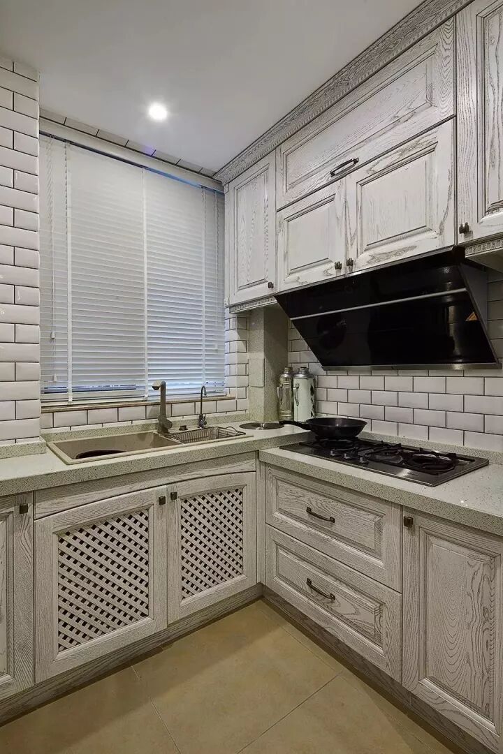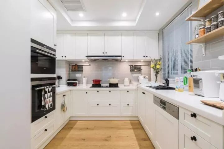 现代美式因为年轻而又优雅高档,最近可以说是个比较火的风格,因此这种风格的厨房也比较常见;通常都以带纹理图案的橱柜面板为主,颜色有白色、蓝色、复古绿等,常见以白色为主;