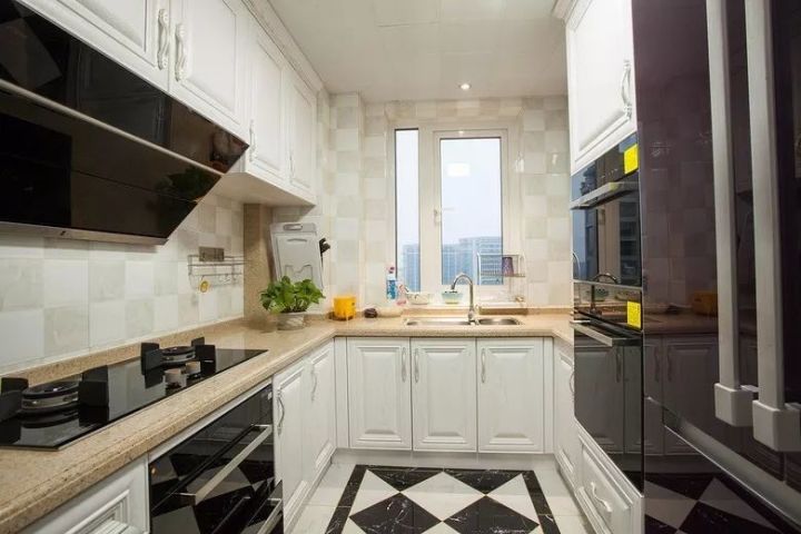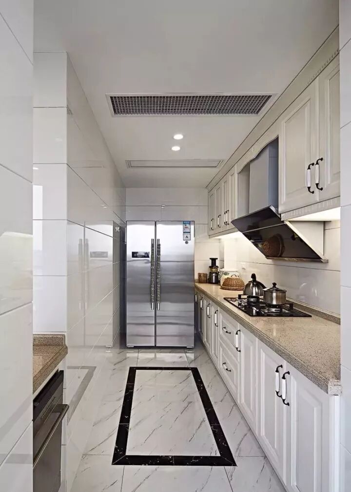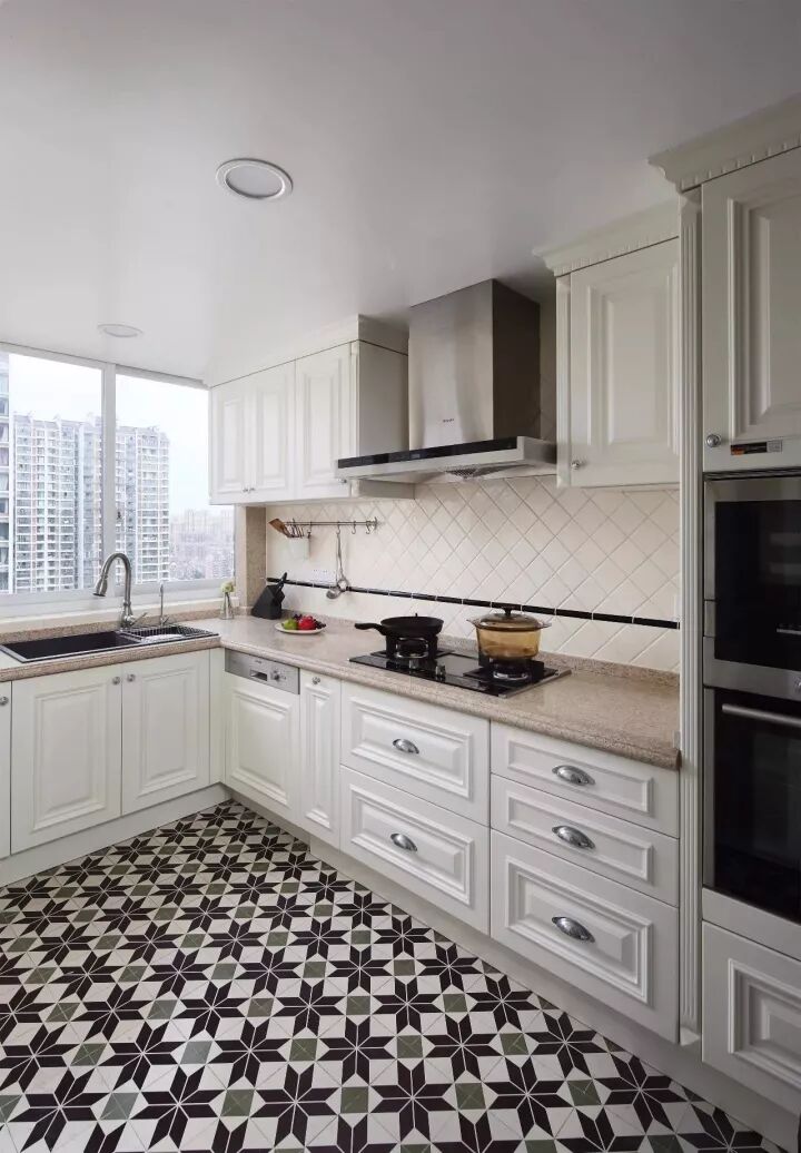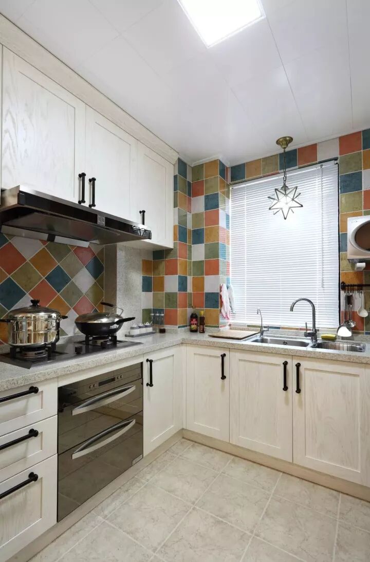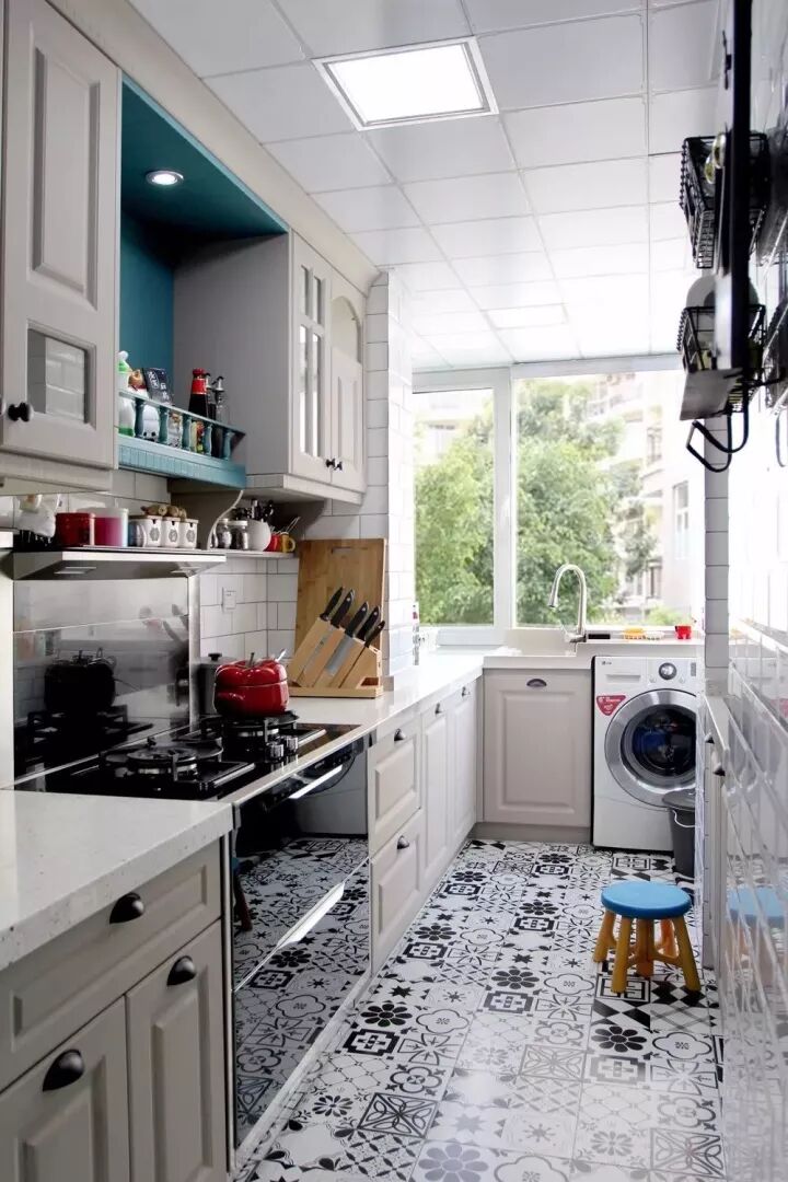 现代美式因为年轻而又优雅高档,最近可以说是个比较火的风格,因此这种风格的厨房也比较常见;通常都以带纹理图案的橱柜面板为主,颜色有白色、蓝色、复古绿等,常见以白色为主;