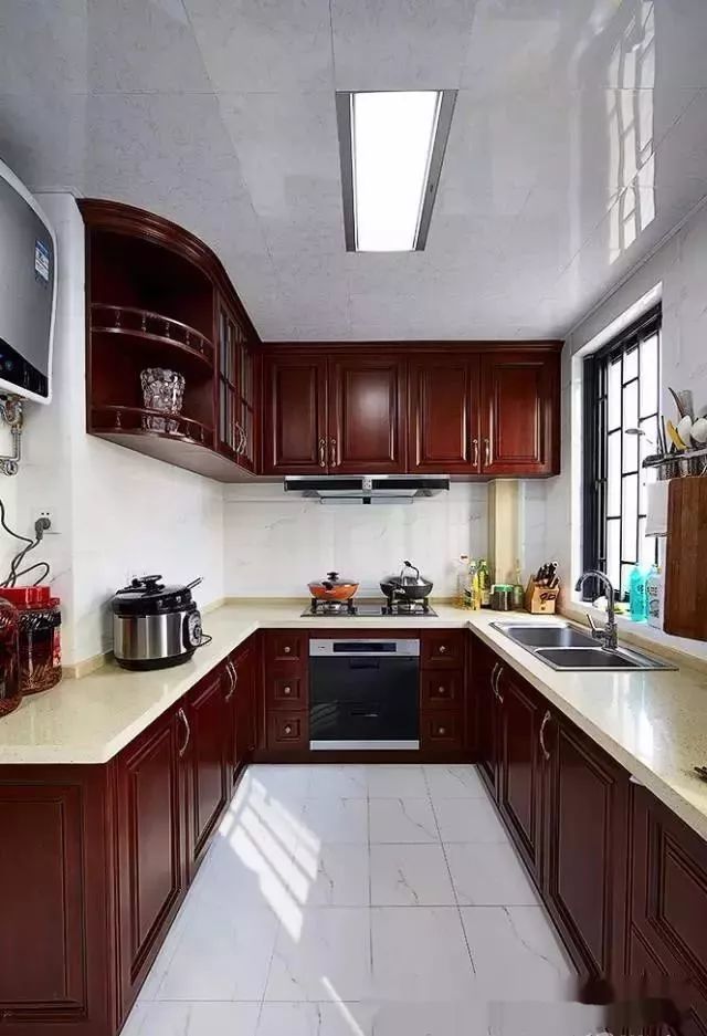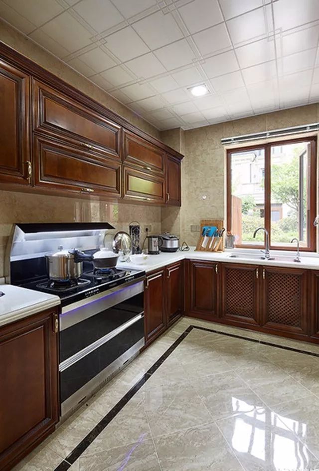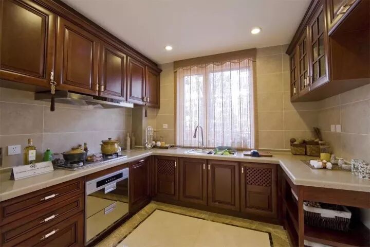中式风格是咱们的传统,而把中式的橱柜装到厨房里面,效果也是想得相当的高档端庄;