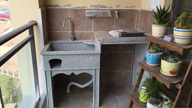 阳台,装修比较简单,安装的简易洗衣槽,对比要更加的结实耐用,并摆放的木制置物架,种养了一些绿植,给生活增添了一些绿意。