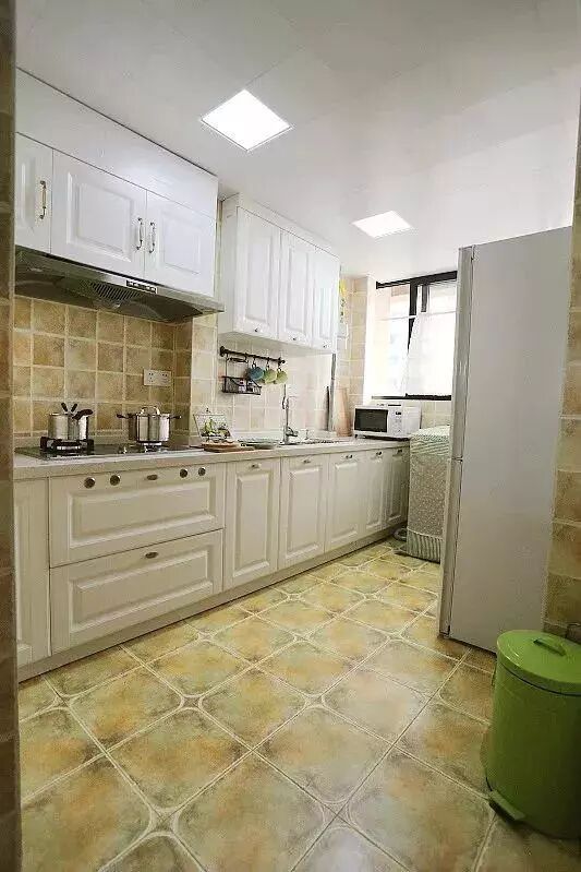 厨房的面积整体比较宽松舒适,浅色复古砖搭配象牙白橱柜,同时把洗衣机也布置在厨房,整体显得优雅又实用;