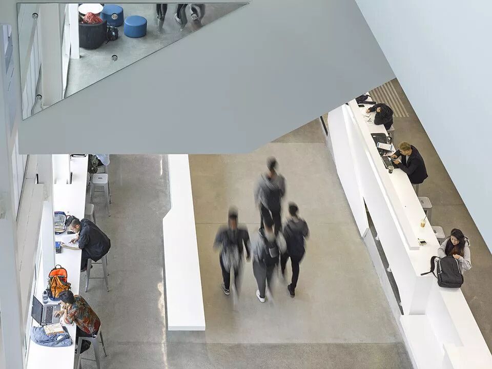 该建筑采用革新的技术和精致的细节,通过建筑师与客户,工程施工负责人以及各相关建设工作人员的紧密合作,以每平方英尺约280美元的造价实现。建筑以Semper的艺术理论为设计灵感和主要形态,极具对建造成本的考量,通过直接或间接展露钢结构而彰显了该建筑在结构上的创新。建筑以体验性结构为设计核心,如横贯三层空间的结构采光井;裸露在大厅中的膨胀型钢结构;以及室内石膏板墙壁所暗示的组成结构。建筑内部于采光井周围设置多层“旋涡休息厅”,这一系列空间为学生营造了多种非正式的学习环境。开放性的楼梯间引领学生穿梭在建筑各层,将栩栩如生的动态画面如荧屏般呈现在校园之中。