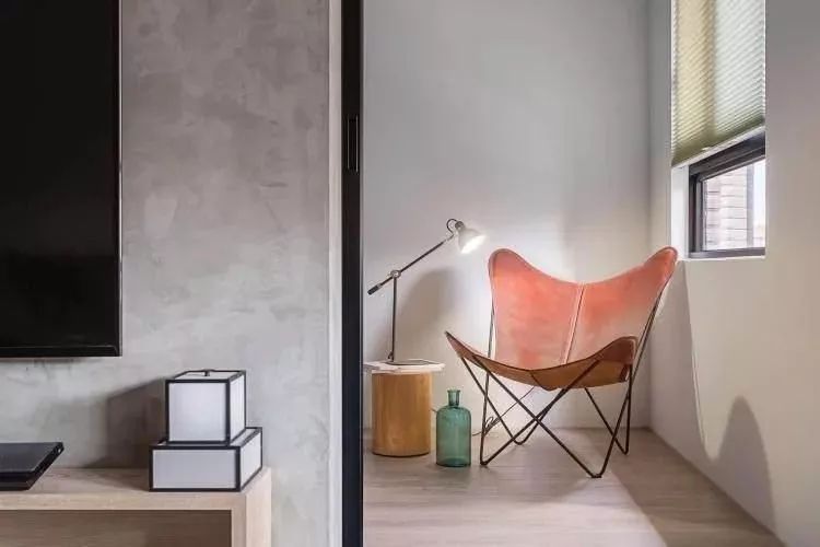 次卧是藏在了电视背景墙的后方,电视背景墙也把推拉门给隐藏了起来,给次卧摆上舒适的椅子和茶几,就成为了最好的阅读角。