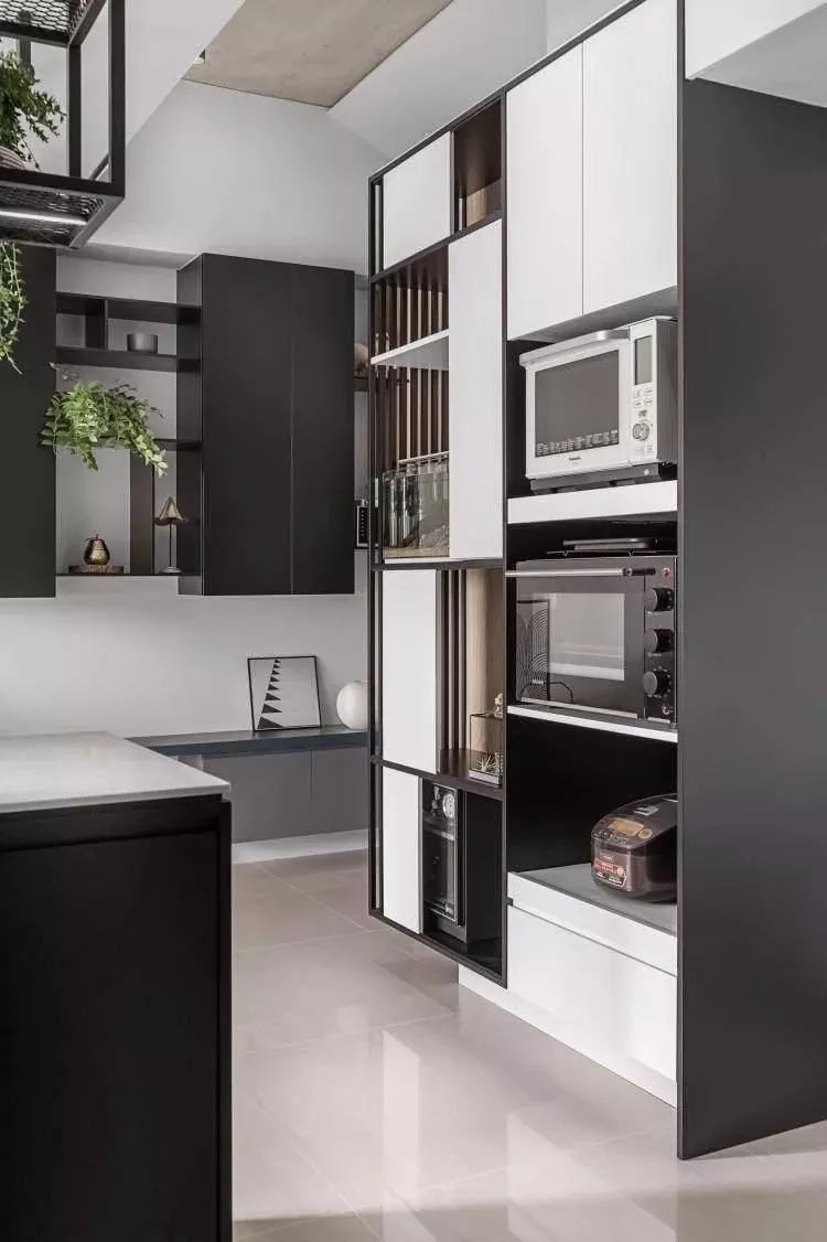 餐厅直接用吧台来代替,作为开放式厨房延伸出来的小吧台,在使用上非常的方便,黑色的吧台也更有高级感。