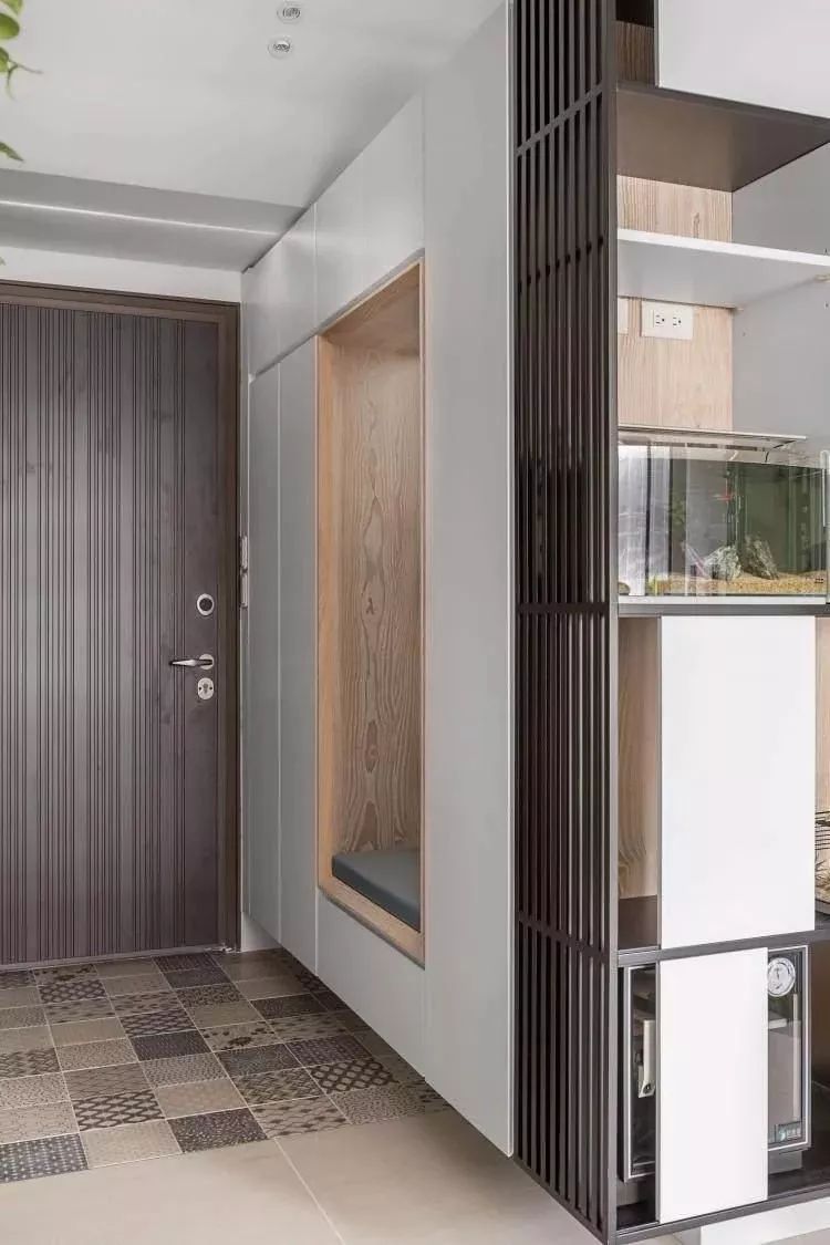 入户玄关处做了嵌入式的鞋柜,还预留了换鞋凳区域和底部空间,非常方便平时更换鞋子。玄关处也用花砖和室内做了分隔。