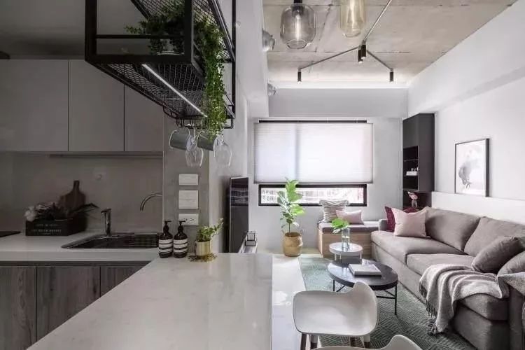 开放式的厨房肯定要多加注意一些油烟问题,吧台餐厅上方的架子可以摆放很多绿植,让这个角落更显小清新感。