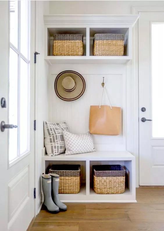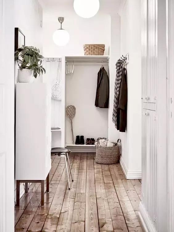 如果家里常住的人数不多的话,更建议只装隔板架,其它的比如板凳或挂钩就不要布置了,直接留白,这样既可以保持空间的通透,整个空间的视觉也会有扩充的效果。
