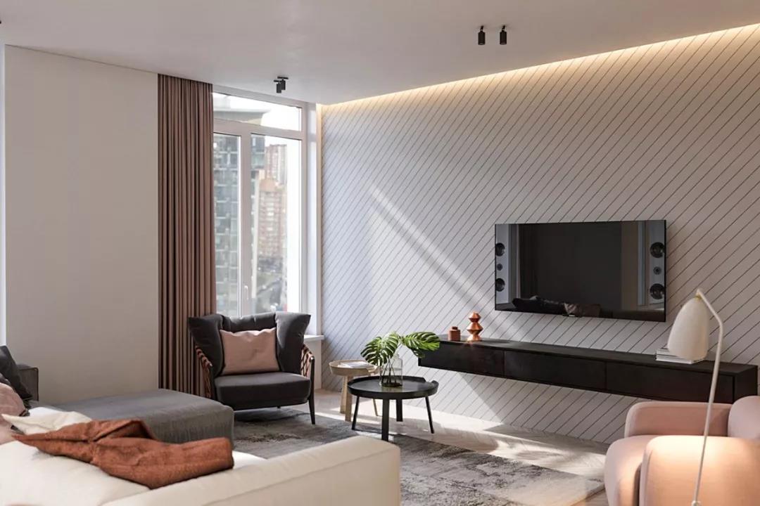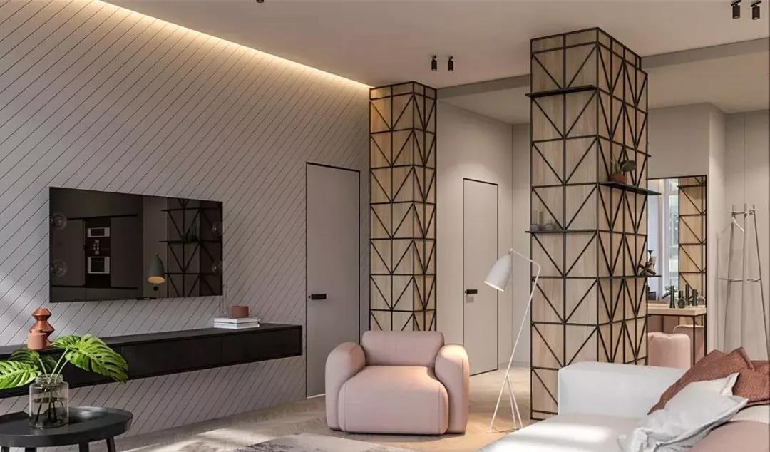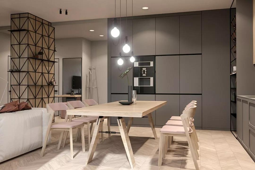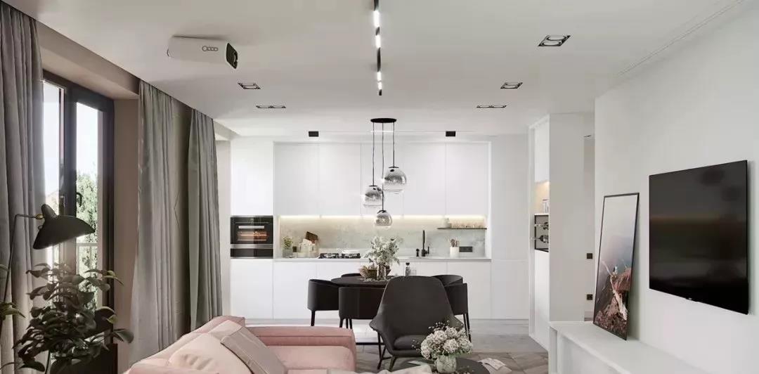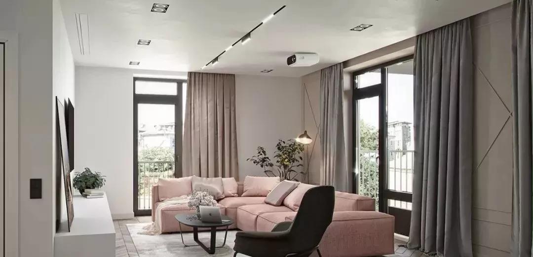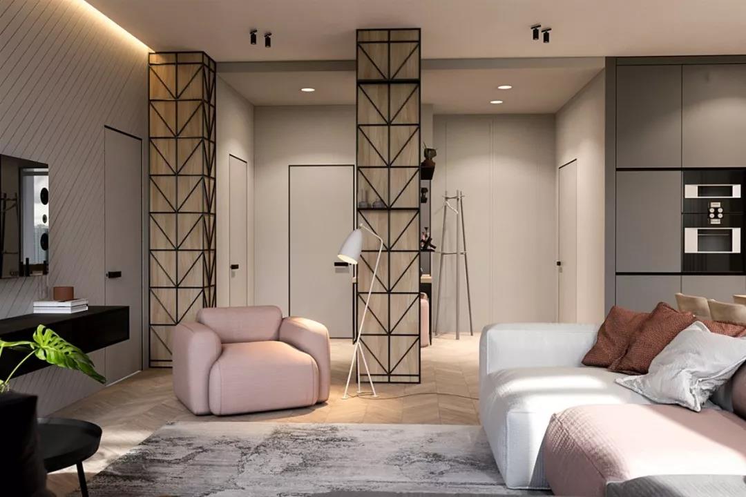 粉红色给人的既定印象是少女心,通常使用在女孩房中,但 Yumo Architects 设计团队的这起乌克兰公寓案例,则说明了如何以粉红色为空间形塑现代文艺感。客厅以大面积的藕粉色模块沙发为暖色系空间注入一丝亮点,奶茶色壁面搭配灰色窗帘,地面沿用同一色调的鱼骨纹木地板,和藕粉色沙发相呼应,显得清新优雅。