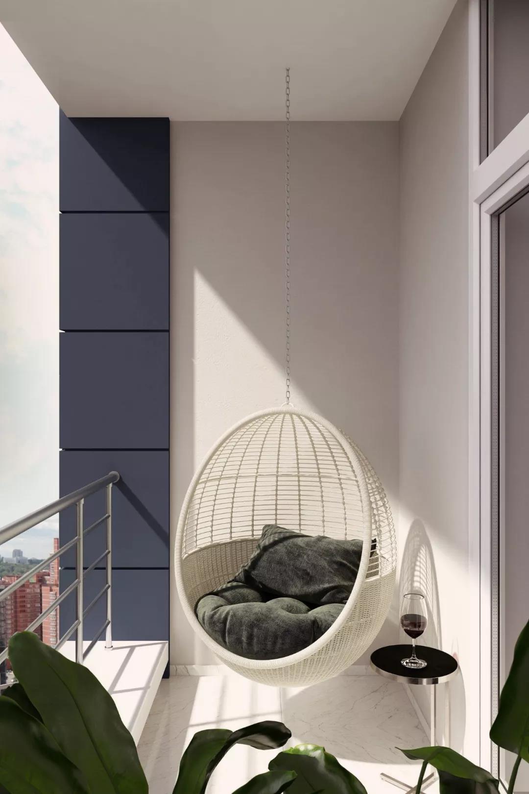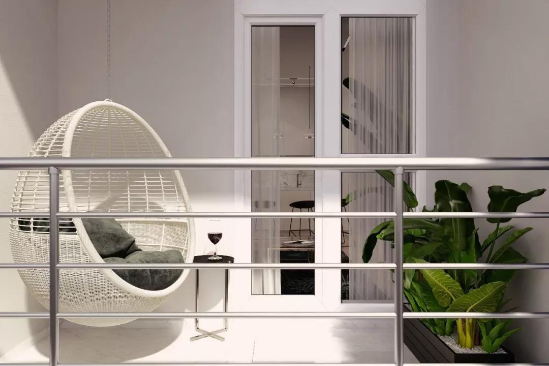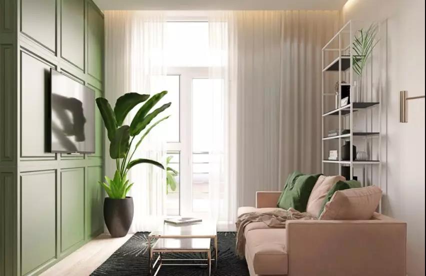 从客厅到卧室不论墙面或是家具,皆采用彩度较低的玫瑰粉色搭衬自然墨绿,赋予空间自然清新氛围,并运用温润木质地板,使客餐厅给予人独立坚强却又不失温柔的意象。另外,也于阳台处悬挂藤编吊椅,让人在假日午后,可窝进裡头与美好夕阳共享一杯香醇红酒。