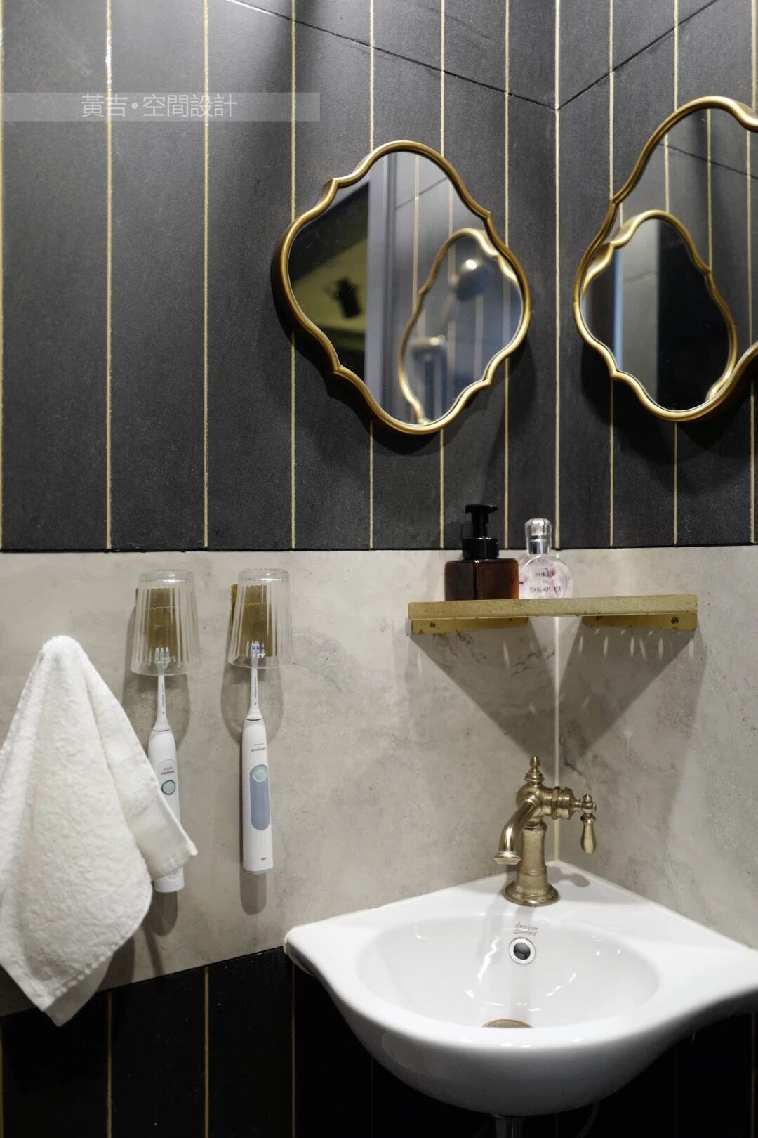 黄铜元素的边框搭配深色墙面