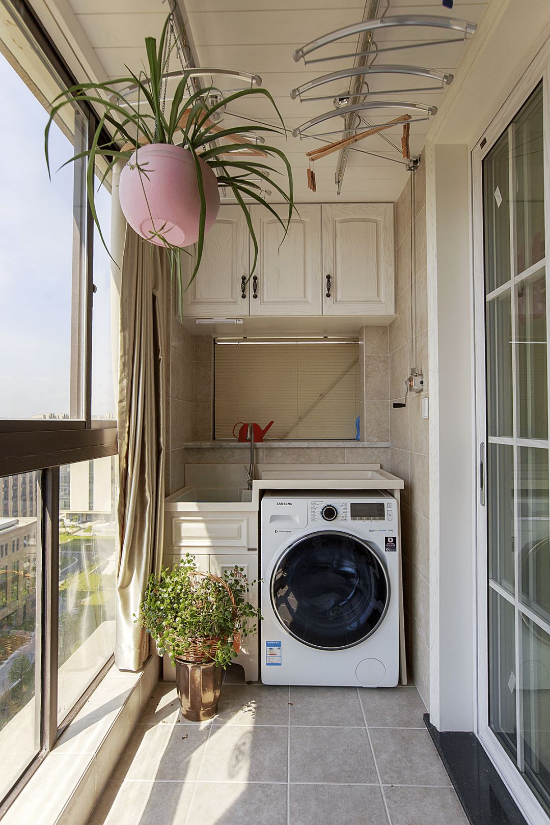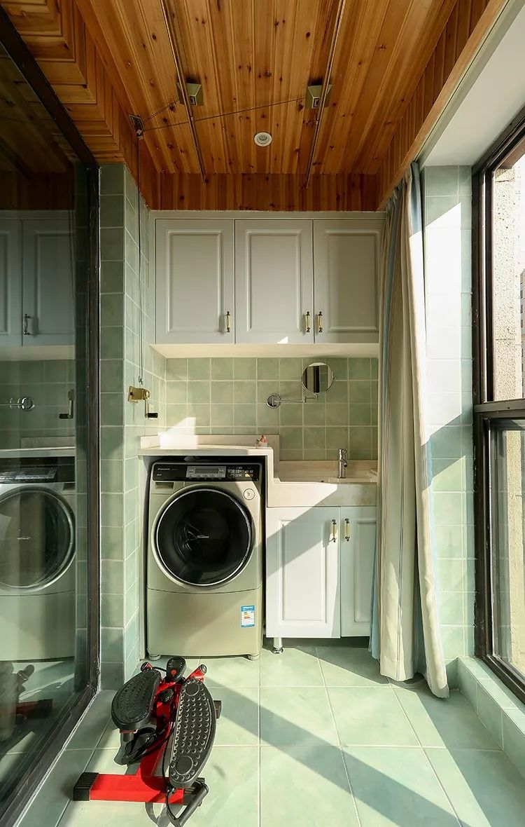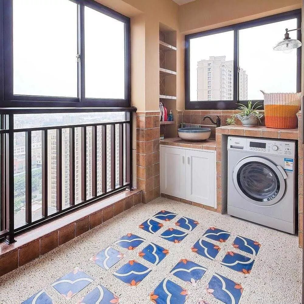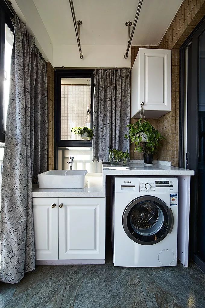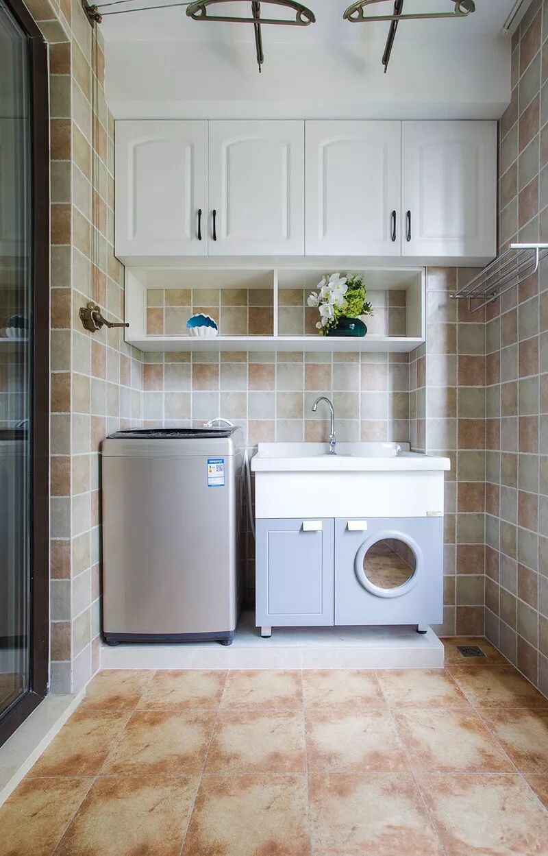 1、空间有限的话,阳台一侧设洗手台,另一侧放洗衣机,还可以做一些搁架、收纳柜补充收纳。