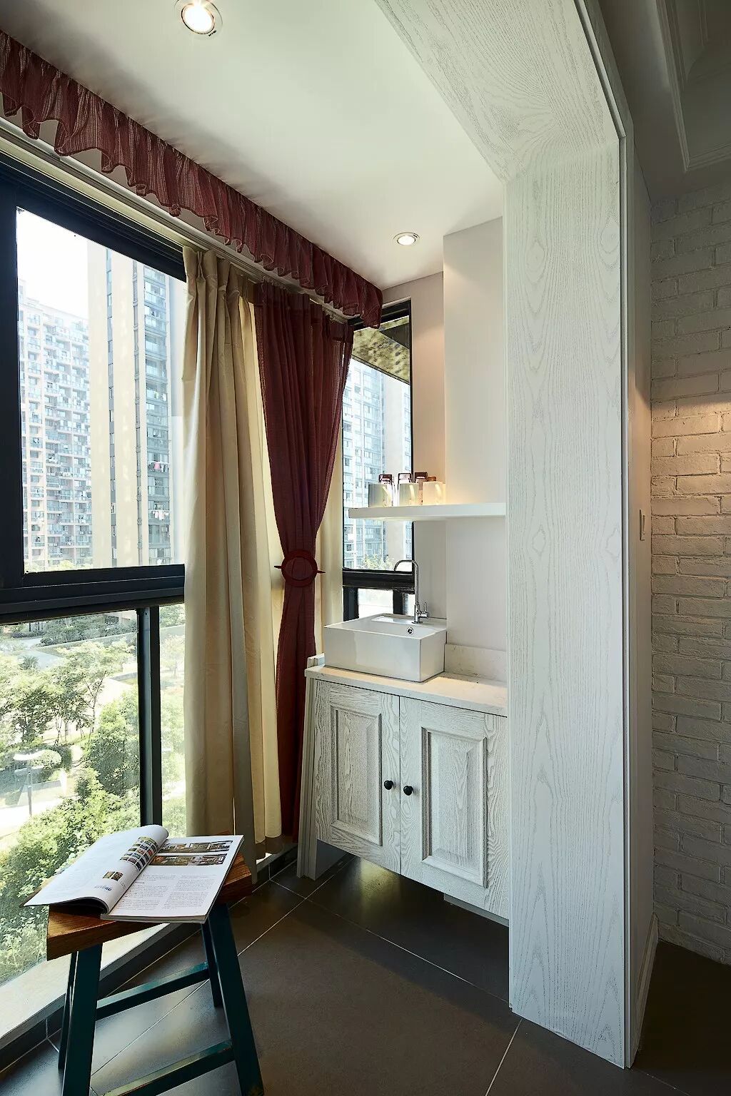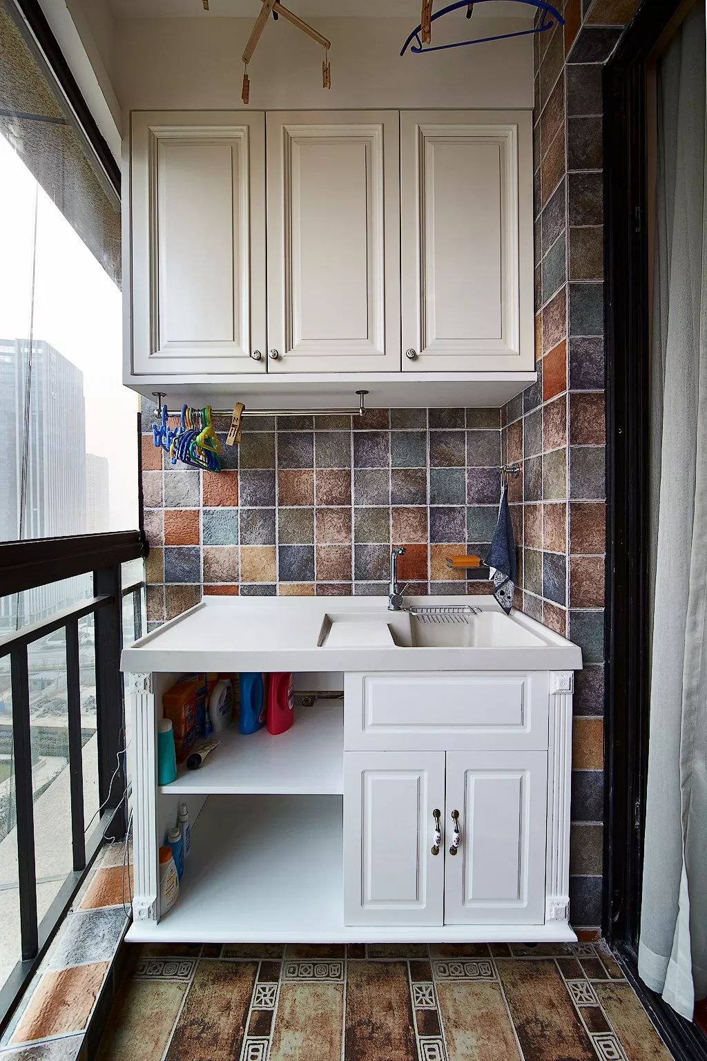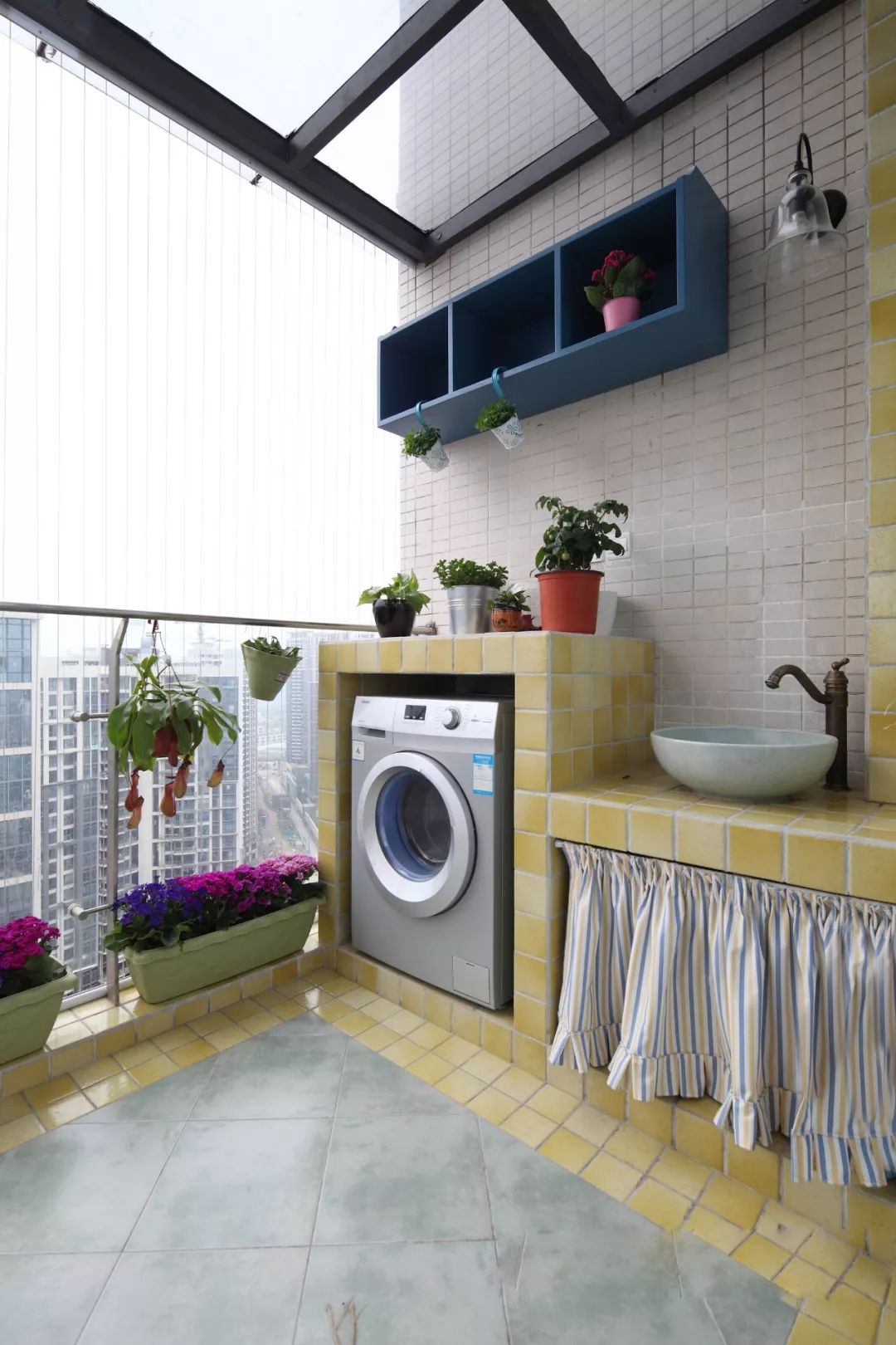 1、空间有限的话,阳台一侧设洗手台,另一侧放洗衣机,还可以做一些搁架、收纳柜补充收纳。