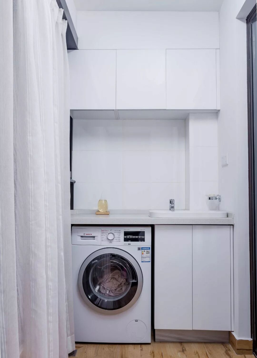 6、空间稍微宽裕点,可以将洗手台和洗衣机一体化,会显得更加清爽整洁。