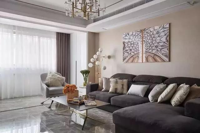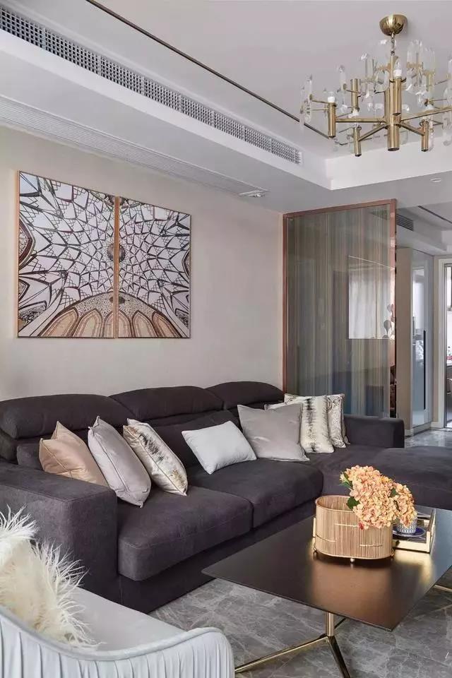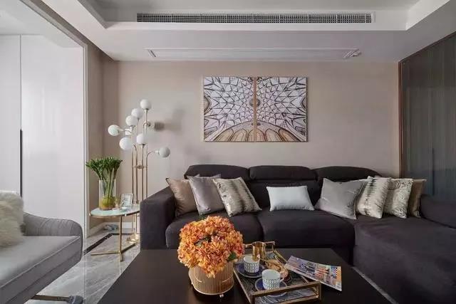 沙发墙的装饰画吸引了视线的聚焦,配合沙发旁生动有趣的铜座落地灯,给客厅空间带来更多的可观性和活跃度。