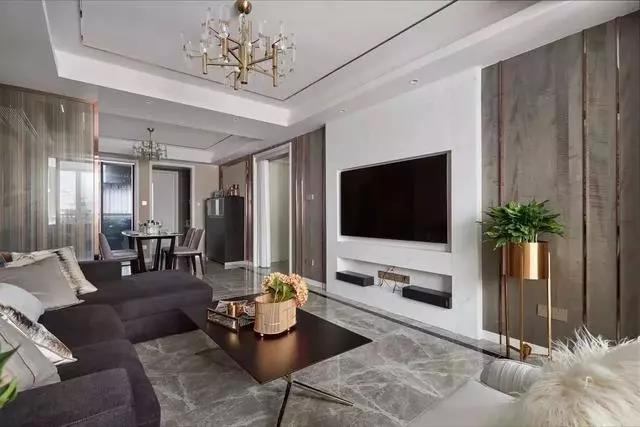 今天给大家分享的是140㎡复式的轻奢风格装修,低调奢华有内涵!进门右侧的白门通往一个小衣帽间,换下的鞋子也能“藏”得好好的,这样不杂乱的玄关很是清爽。素净整洁的立面,光洁亮丽的地面,配合边线的衬托,奠定了一个简约又略带轻奢的客厅基调。放弃电视柜,电视和音响都是入墙式的收纳,雅士白的电视墙两边是木饰面