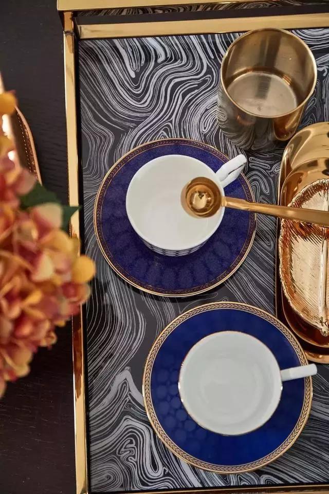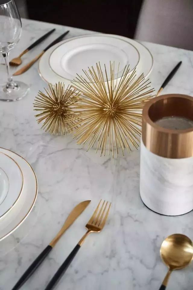 铜艺架子的边几,以大理石质感为台面,摆上绿植后也是显得清新精致。