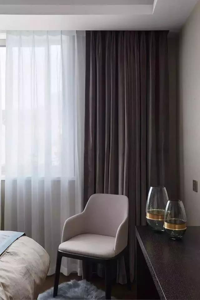 窗帘选择了与床头背景相近的色系,整体和谐而统一。