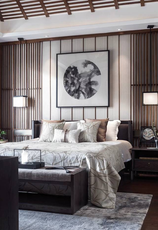 卧室背景墙采用细木条竖向分割,简洁明朗的木质格栅、时尚稳重的家具以及暖色的灯光氛围,使空间兼具温馨舒适与典雅贵气。