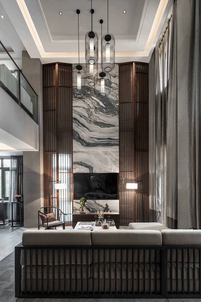 空间对称的结构、材质的运用及软装陈列方式都体现出中式的韵味与仪式感,在东方美学被不断提起的今天,呈现出一种开放的姿态,并保持自我的风格客厅中空挑高,二楼起居室与楼下对望。入口玄关的空间规划恰到好处地实现了储藏和展示的双重功能。客厅整体设计极力呈现别墅空间雅致、安静的力量。满墙书架式设计作为立面极具震